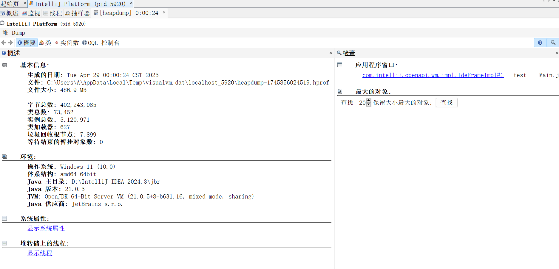 VisualVM 是一款图形化工具,可以实时监控 Java 程序的运行状态,分析 CPU 使用率、内存占用、线程活动情况、类加载信息等,甚至可以抓取堆快照(Heap Dump)分析内存泄漏。