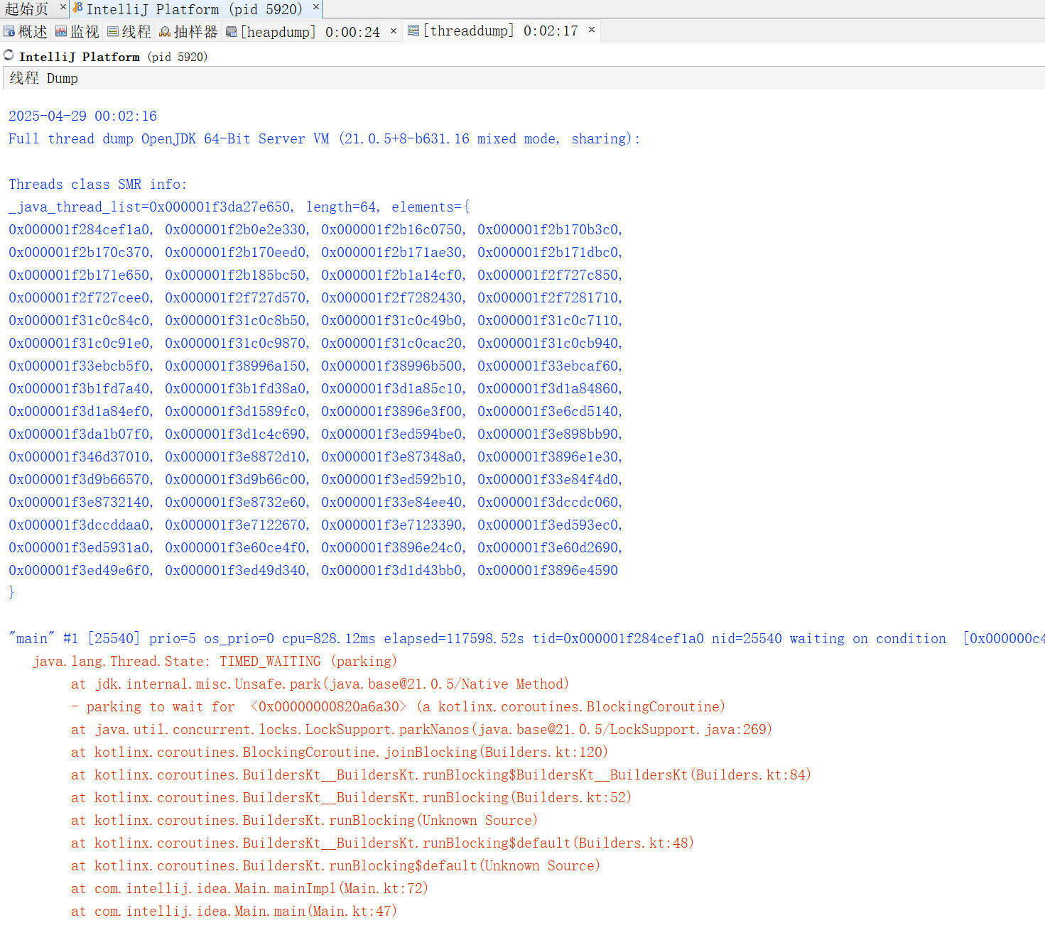 可以执行线程Dump,抓取当前所有线程的堆栈信息,排查死锁、线程阻塞等问题。
