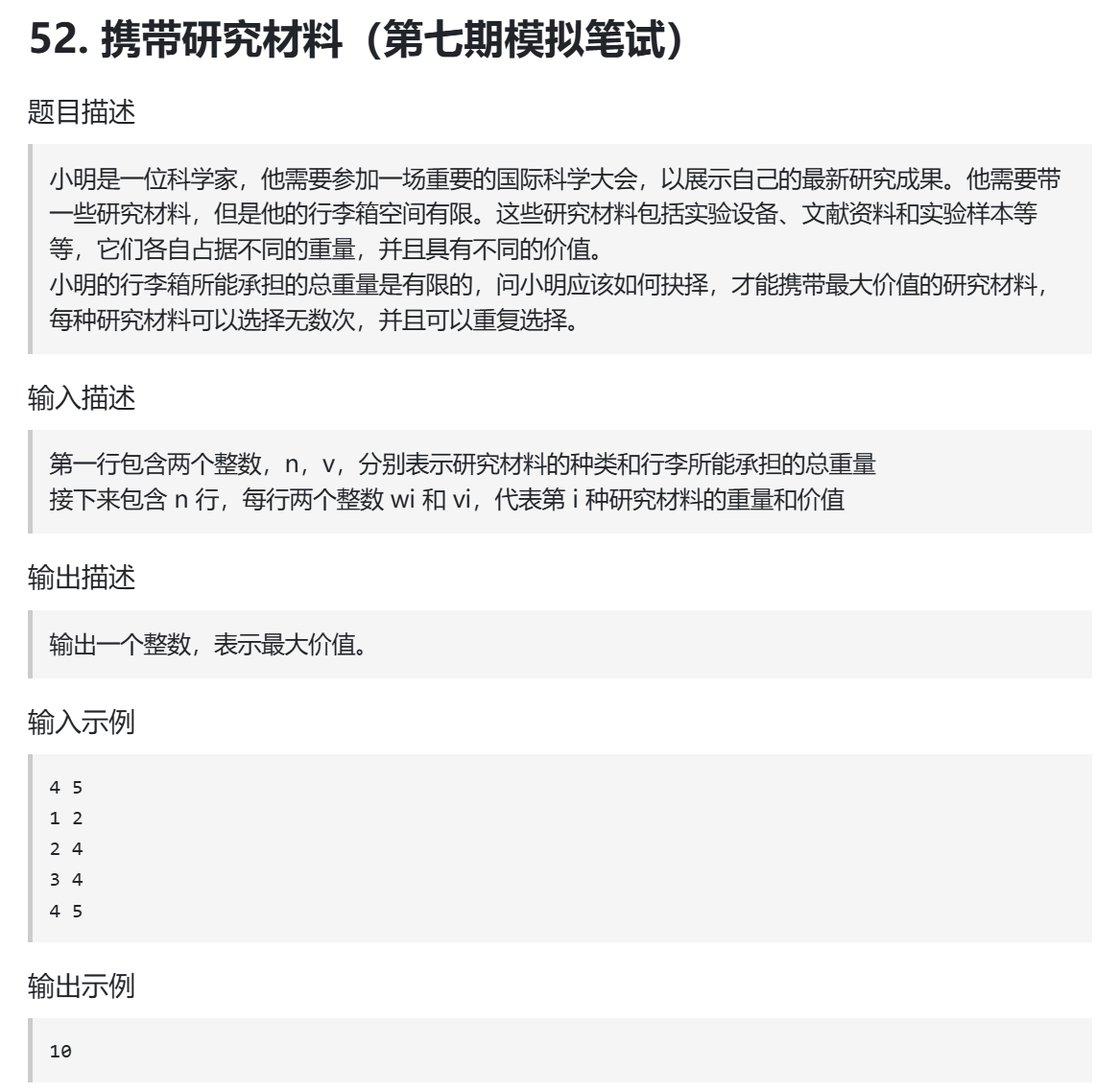 import java.util.Scanner; public class Main { public static void main(String[] args) { Scanner scanner = new Scanner(System.in); int n = scanner.nextInt(); int bagWeight = scanner.nextInt(); int[] weight = new int[n]; int[] value = new int[n]; for (int i = 0; i < n; i++) { weight[i] = scanner.nextInt(); value[i] = scanner.nextInt(); } int[][] dp = new int[n][bagWeight + 1]; // 初始化 for (int j = weight[0]; j <= bagWeight; j++) { dp[0][j] = dp[0][j - weight[0]] + value[0]; } // 动态规划 for (int i = 1; i < n; i++) { for (int j = 0; j <= bagWeight; j++) { if (j < weight[i]) { dp[i][j] = dp[i - 1][j]; } else { dp[i][j] = Math.max(dp[i - 1][j], dp[i][j - weight[i]] + value[i]); } } } System.out.println(dp[n - 1][bagWeight]); scanner.close(); } }
