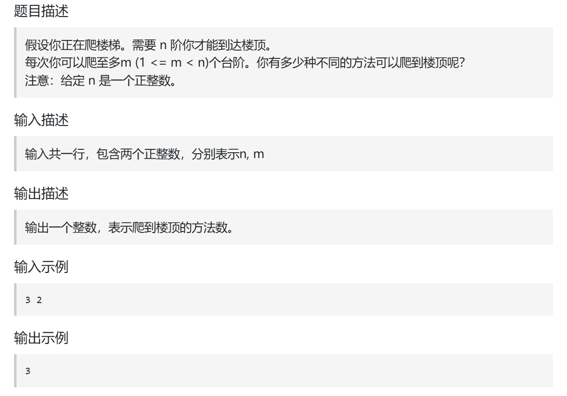 import java.util.Scanner; class climbStairs{ public static void main(String [] args){ Scanner sc = new Scanner(System.in); int m, n; while (sc.hasNextInt()) { // 从键盘输入参数,中间用空格隔开 n = sc.nextInt(); m = sc.nextInt(); // 求排列问题,先遍历背包再遍历物品 int[] dp = new int[n + 1]; dp[0] = 1; for (int j = 1; j <= n; j++) { for (int i = 1; i <= m; i++) { if (j - i >= 0) dp[j] += dp[j - i]; } } System.out.println(dp[n]); } } } ------------------------------------------------------------ //斐波那契数做法 class Solution { public int climbStairs(int n) { //1.确定dp数组的含义:dp[i],达到第i层有多少种方法 //2.确定递推公式:dp[i] = dp[i-1]+dp[i-2]; //3.初始化 if(n == 1){ return n; } int[] dp = new int[n+1]; dp[1] = 1; dp[2] = 2; for(int i=3; i<=n; i++){ dp[i] = dp[i-1] + dp[i-2]; } return dp[n]; } }