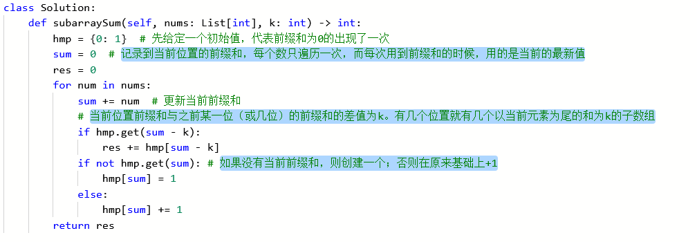 对于 S[i - 1],有 n 个前缀和为 S[i - 1] 的位置,就有 n 个以 S[j] 为结尾的和为 K 的子数组(这一点就是前缀和思想的核心,比较不好理解。第一次接触这个思想需要多看几遍)