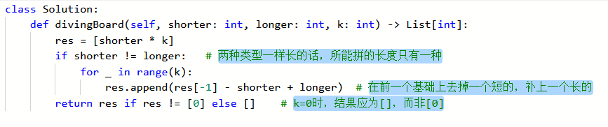 你正在使用一堆木板建造跳水板。有两种类型的木板,其中长度较短的木板长度为shorter,长度较长的木板长度为longer。你必须正好使用k块木板。编写一个方法,生成跳水板所有可能的长度。