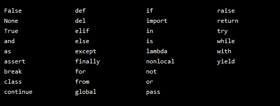 3)规则:标识符可以包含字母、数字、 _, 但是不能使用数字做开头。例如 name1 name_1 1name(No)。Python中不能使用关键字和保留字作为标识符。