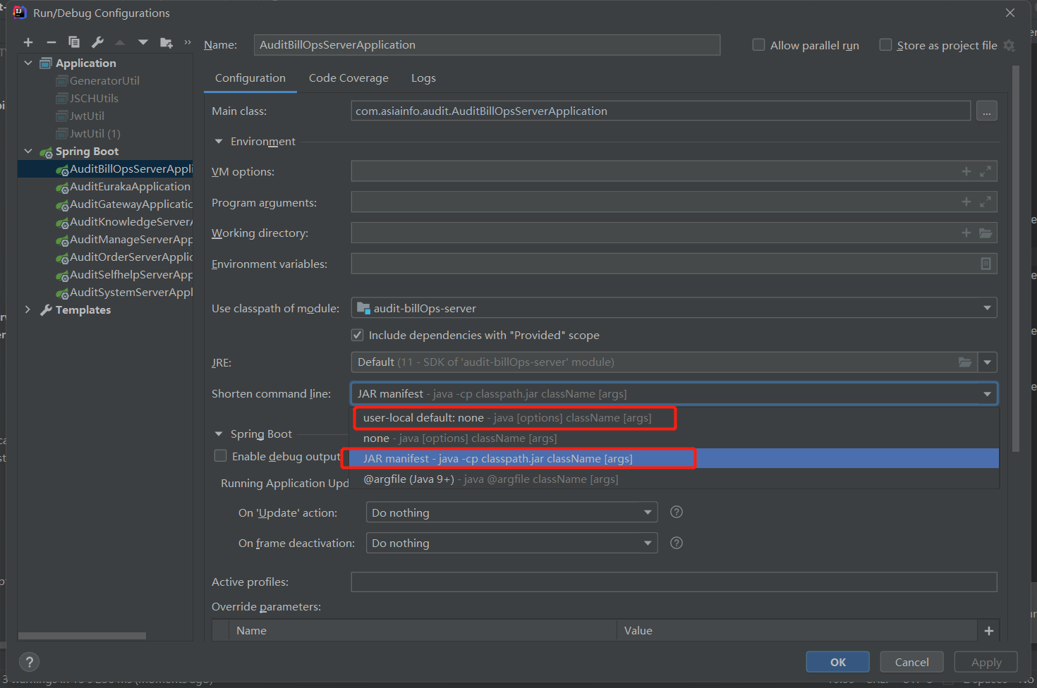 idea 解决Command line is too long. Shorten command line for AuditSelfhelpServerApplication or also for Spring