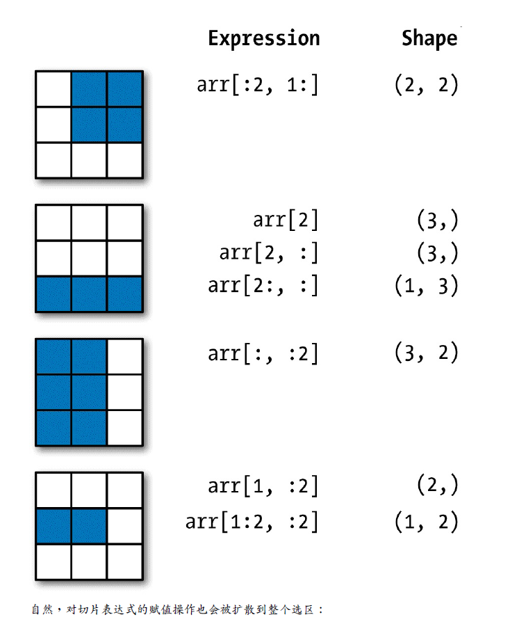 In [60]: arr = np.arange(10) In [61]: arr Out[61]: array([0, 1, 2, 3, 4, 5, 6, 7, 8, 9]) In [62]: arr[5] Out[62]: 5 In [63]: arr[5:8] Out[63]: array([5, 6, 7]) In [64]: arr[5:8] = 12 In [65]: arr Out[65]: array([ 0,1,2,3,4, 12, 12, 12,8,9])