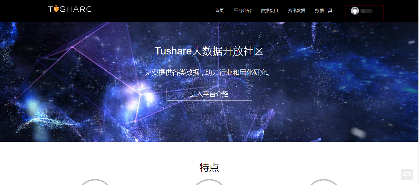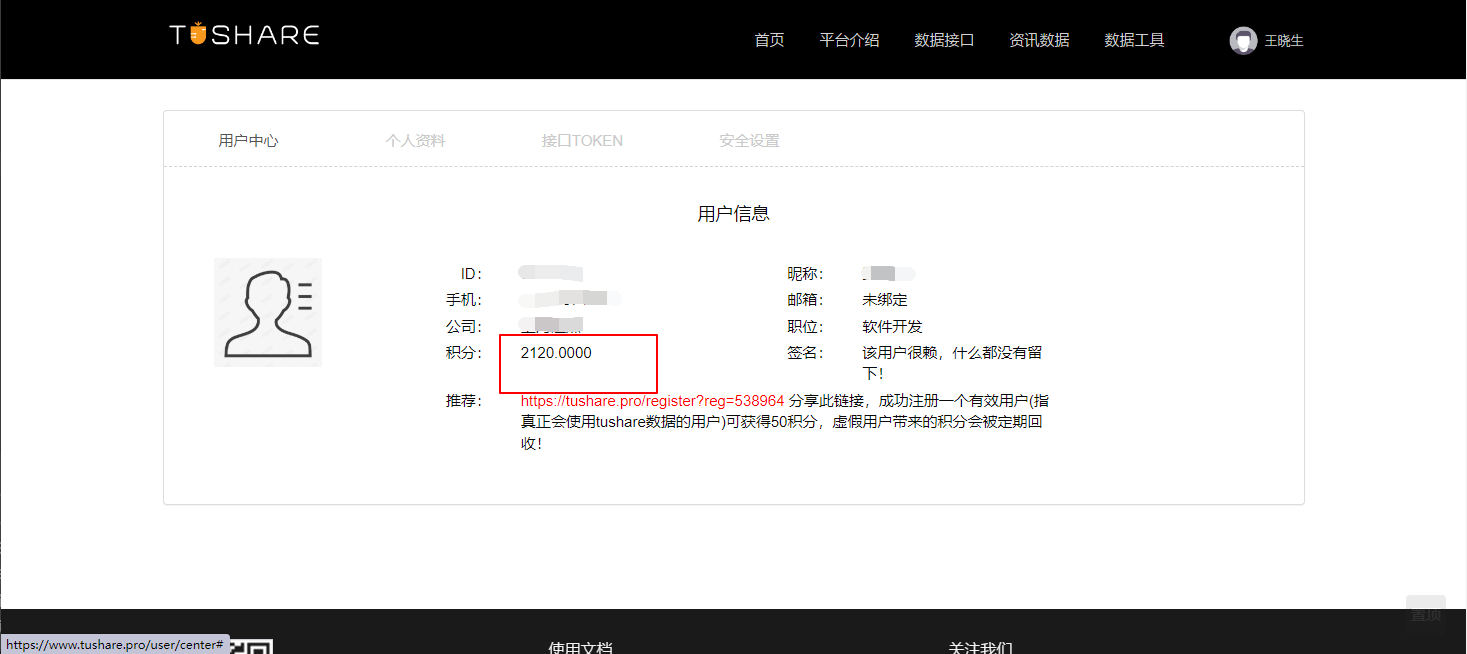 TuShare官网进入,注册并登陆个人账户,进入个人主页