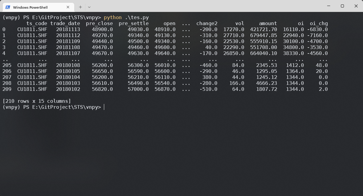 Python测试脚本import tushare as ts ts.set_token('你的token') pro = ts.pro_api() df = pro.fut_daily(ts_code='CU1811.SHF', start_date='20180101', end_date='20181113') print(df)