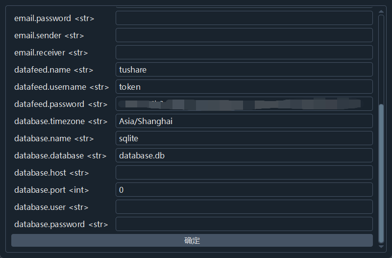 名称 含义 必填 举例 datafeed.name 名称 是 tushare datafeed.username 用户名 否 token datafeed.password 密码 是 c3a110417f08f26d2c221edc0c50d4a8a5001502eea89cf5