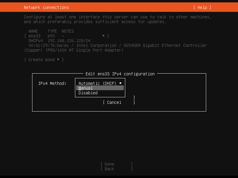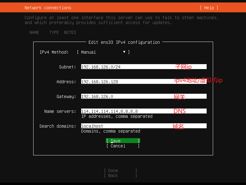 选择 DHCP 会有一个小小的问题,就是你的虚拟机的IP地址可能会变化,这样你就需要重新配置你的虚拟机的IP地址,这样就会很麻烦。所以,我建议你选择手动设置IP地址。
