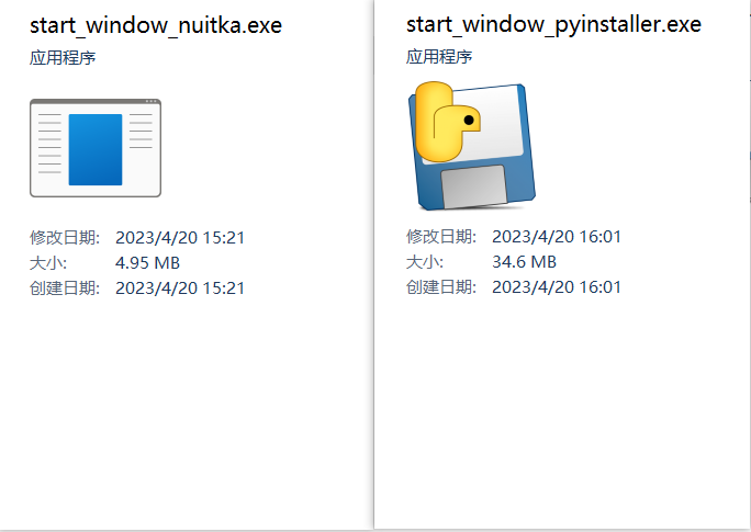Nuitka打包后的可执行文件大小为 4.95M,PyInstaller打包后的可执行文件大小为 34.6M。
