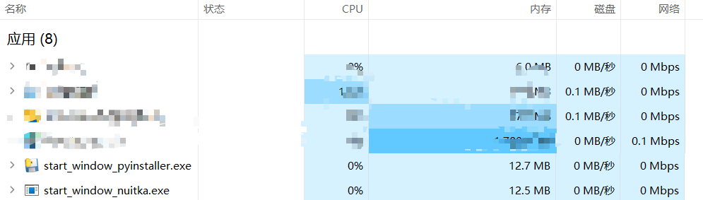 根据众多网友的测试得出的结果,Nuitka打包后的可执行文件占用内存较少,PyInstaller打包后的可执行文件占用内存较多。但是,作者通过demo的测试发现两者区别并不是很大,大概都在 10-15M 左右。