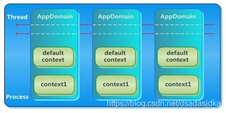 进程(Process)、线程(Thread)、应用程序域(AppDomain)、上下文(Context)的关系如图,一个进程内可以包括多个应用程序域,也有包括多个线程,线程也可以穿梭于多个应用程序域当中。但在同一个时刻,线程只会处于一个应用程序域内。线程也能穿梭于多个上下文当中,进行对象的调用。