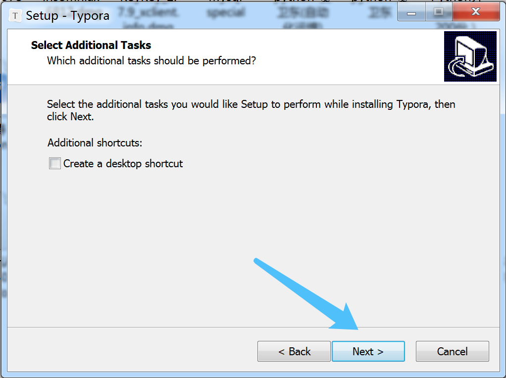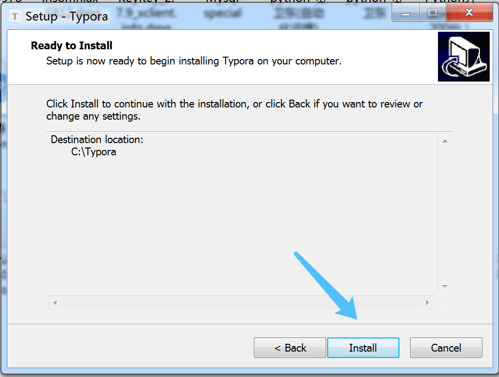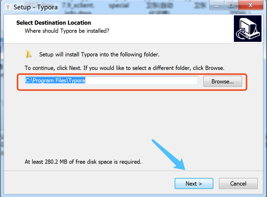 选中的是要安装的路径,建议修改成C:\Typora然后选择Next