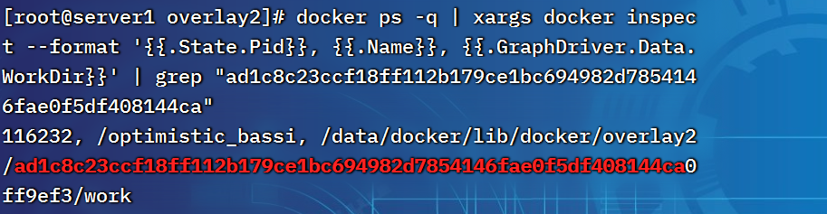 docker ps -q | xargs docker inspect --format '{{.State.Pid}}, {{.Name}}, {{.GraphDriver.Data.WorkDir}}' | grep "ad1c8c23ccf18ff112b179ce1bc694982d7854146fae0f5df408144ca"