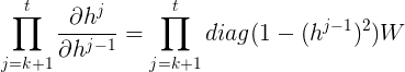 相反,如果矩阵\(W\)中的元素不是小于1,即便tanh的偏导数是很小,累乘项也难以保证tanh'与矩阵的乘积在1附近,因为矩阵\(W\)与tanh'的乘积偶尔出现一两项大于1都会导致数值脱离0~1的范围,随着\(t\)的增大, 梯度大于1,即“梯度爆炸”。