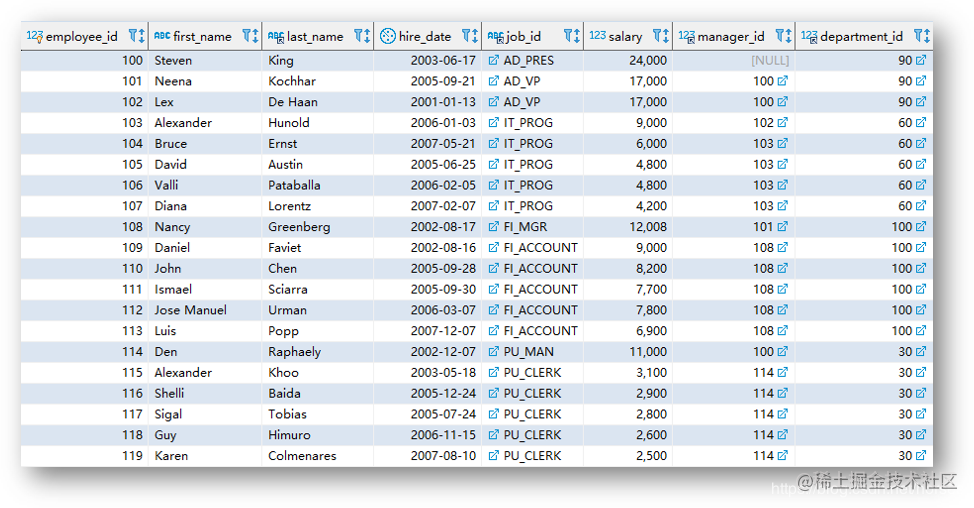 它的作用就是从 employees 表中查询员工信息。显然,我们都知道 FROM 之后是一个表(关系、集合)。不仅如此,整个查询语句的结果也是一个表。所以,我们可以将上面的查询作为表使用:
