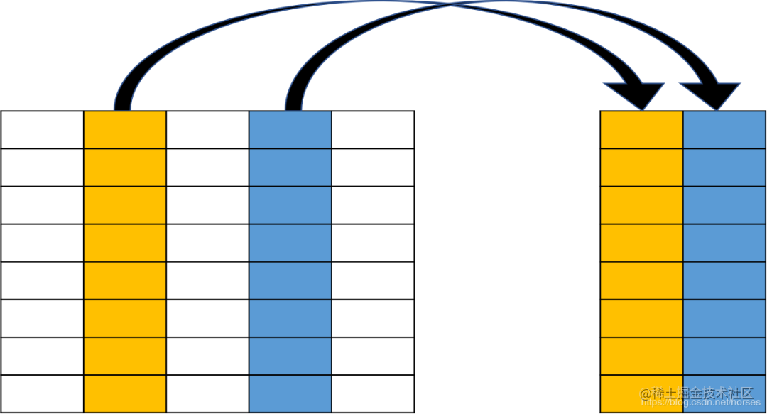 SELECT 子句用于指定需要查询的字段,可以包含表达式、函数值等。SELECT 在关系操作中被称为投影(Projection),看下面的示意图应该就比较好理解了。