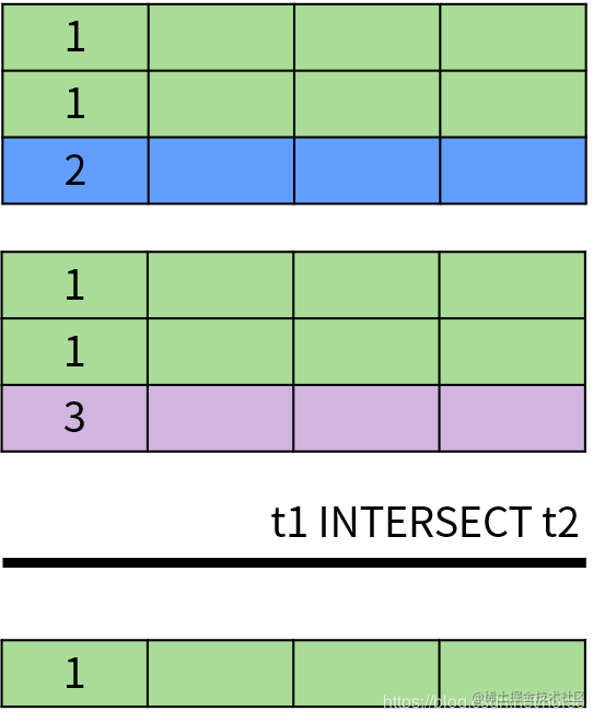 INTERSECT 操作符用于返回两个集合中的共同部分,即同时出现在第一个查询结果和第二个查询结果中的数据,并且排除了结果中的重复数据。INTERSECT 运算的示意图如下: