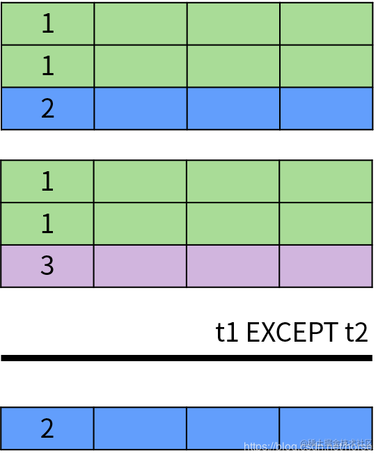 EXCEPT 或者 MINUS 操作符用于返回两个集合的差集,即出现在第一个查询结果中,但不在第二个查询结果中的记录,并且排除了结果中的重复数据。EXCEPT 运算符的示意图如下: