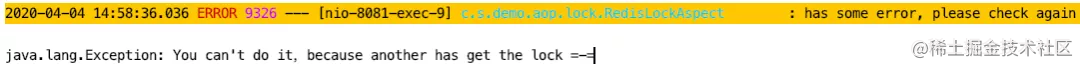 2020-04-04 14:55:52.855 INFO 9326 --- [k-schedule-pool] c.s.demo.aop.lock.RedisLockAspect : businessKey : [Business1:1024], try count : 0