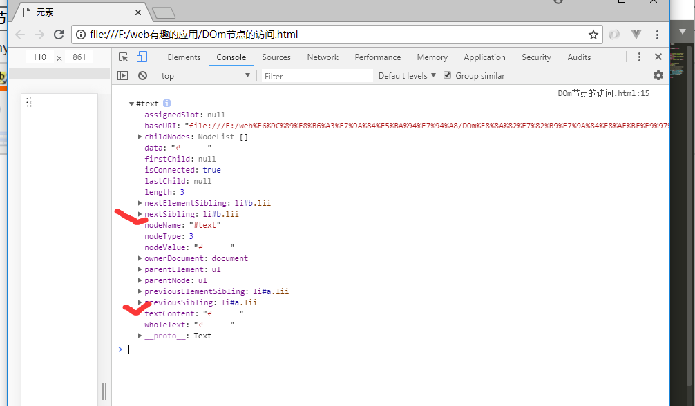 <!DOCTYPE html> <html> <head> <title>元素</title> </head> <body> <ul> <li id='a' class="lii">1</li> <li id="b" class="lii">2</li> <li class="lii">3</li> </ul> <script type="text/javascript"> //var text=document.getElementById('li').firstChild.nodeValue; var text=document.getElementById('b').previousSibling; console.log(text) </script> </body> </html>