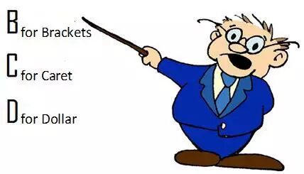 记住正则语法最好的办法就是记住这三样东西:Bracket(括号), caret(插入符号)和Dollars(美元符号)。