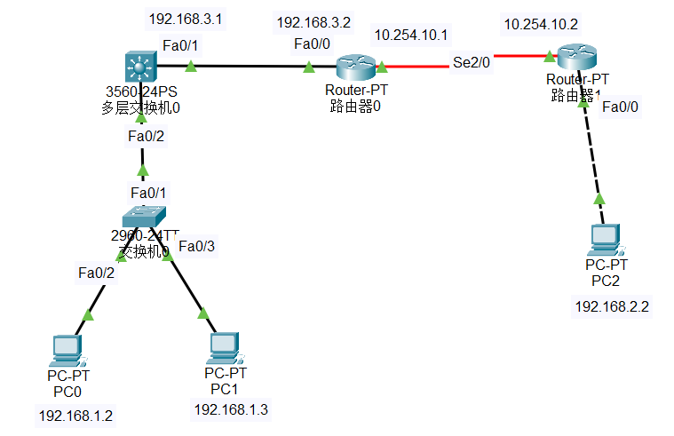 实验设备:Router-PT 2台;Switch_3560 1台;Switch_2960 1台;PC 3台;直通线,交叉线,串口线。