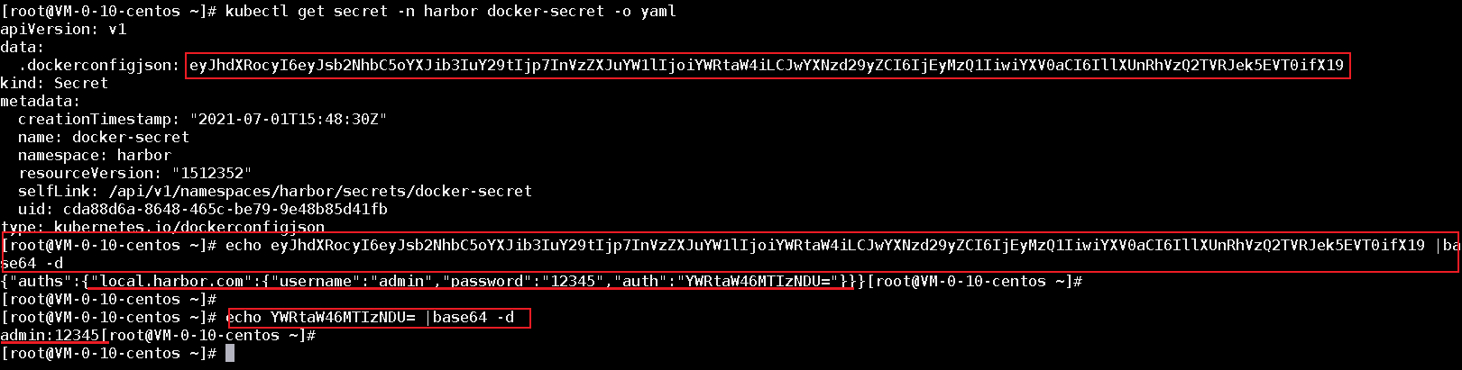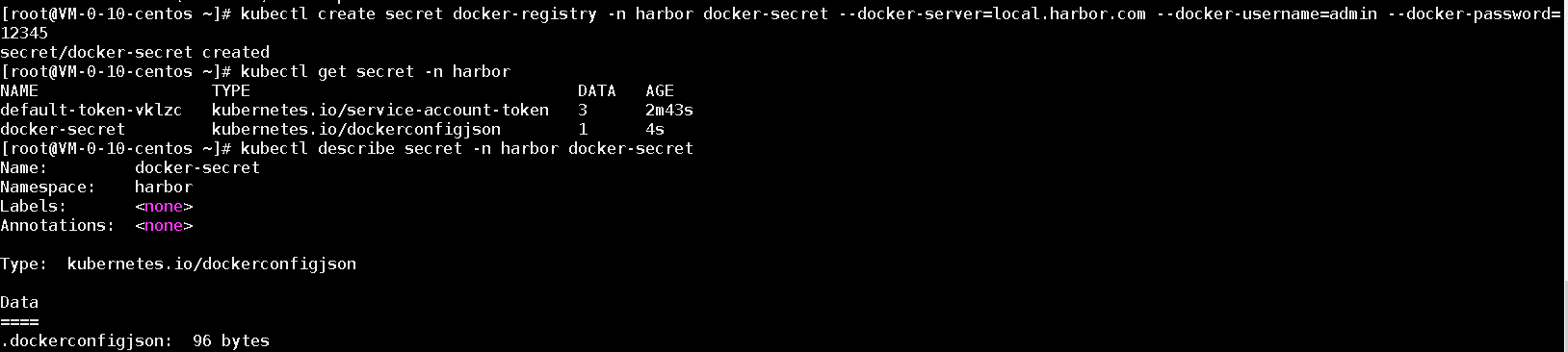 kubectl create secret docker-registry -n harbor docker-secret --docker-server=local.harbor.com --docker-username=admin --docker-password=12345