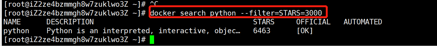 例子:docker search python --filter=STARS=3000。查找仓库中STARS数大于3000的镜像。