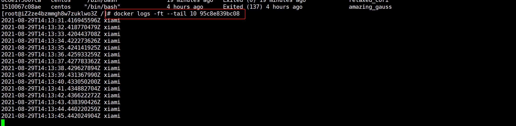 (2)查看日志输出。docker logs -ft --tail 10 容器id