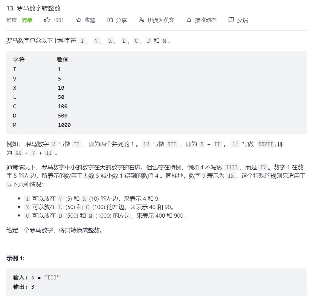 解题思路:罗马数字转整数只有两种情况,一种是正常情况,即右边的数字比左边的小,这种是做加法;另外一种是右边数字比左边数字大,这种情况要做减法。因此可以多往后看一位以确定究竟是做加法还是做减法。时间复杂度O(n),空间复杂度O(1)。