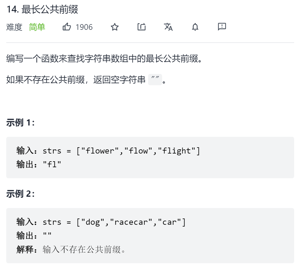 class Solution(object): def longestCommonPrefix(self, strs): """ :type strs: List[str] :rtype: str """ commom_pre = strs[0] for i in range(len(strs)): if i+1 < len(strs): temp = '' for j in range(min(len(commom_pre),len(strs[i+1]))): if commom_pre[j] == strs[i+1][j]: temp+=commom_pre[j] else: break if len(temp) ==0: return "" else: commom_pre = temp else: break return commom_pre