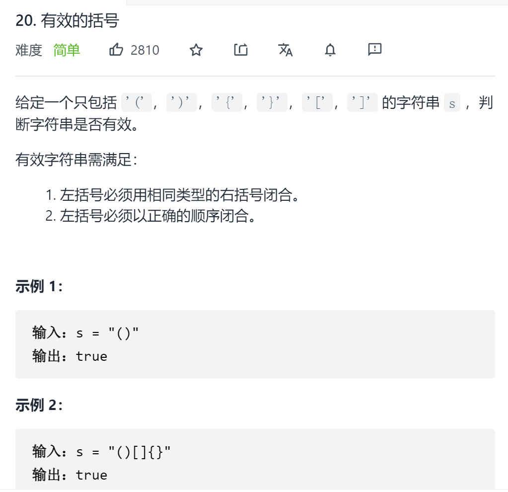 解题思路:如果从字符串指针遍历的角度来分析,这道题就异常复杂。如果使用类似“消消乐”的方式来看待,则会发现一个规律,即我们对于括号的判断是由内而外,即只要内部满足,则不再关注其他逻辑,那是不是意味着可以将满足条件的括号都消除掉呢?由此引入栈每次由内而外取元素进行判断,即只要满足条件则将括号弹出,栈内只保留待判断的括号。时间复杂度O(n),空间复杂度O(n)。