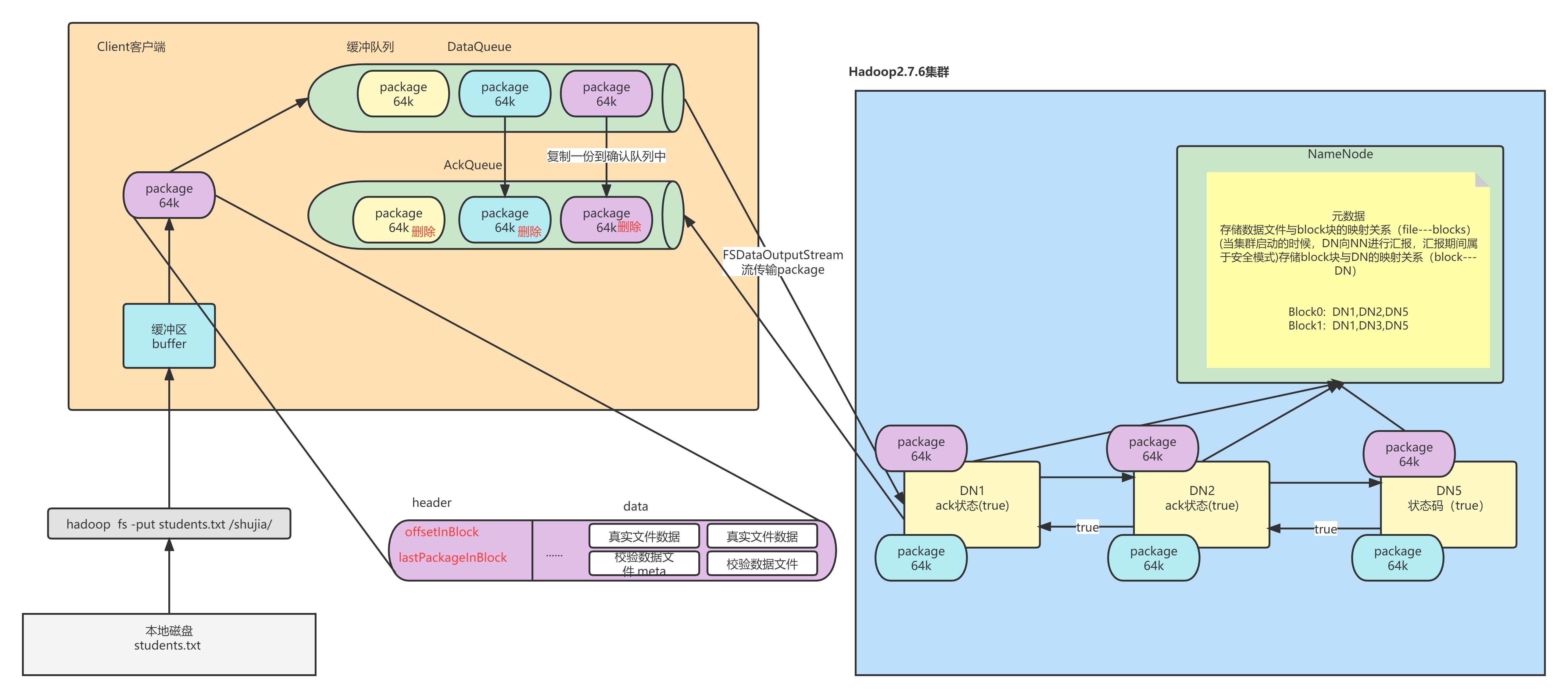 默认一个packet大小为64K,Block128M为2048个packet