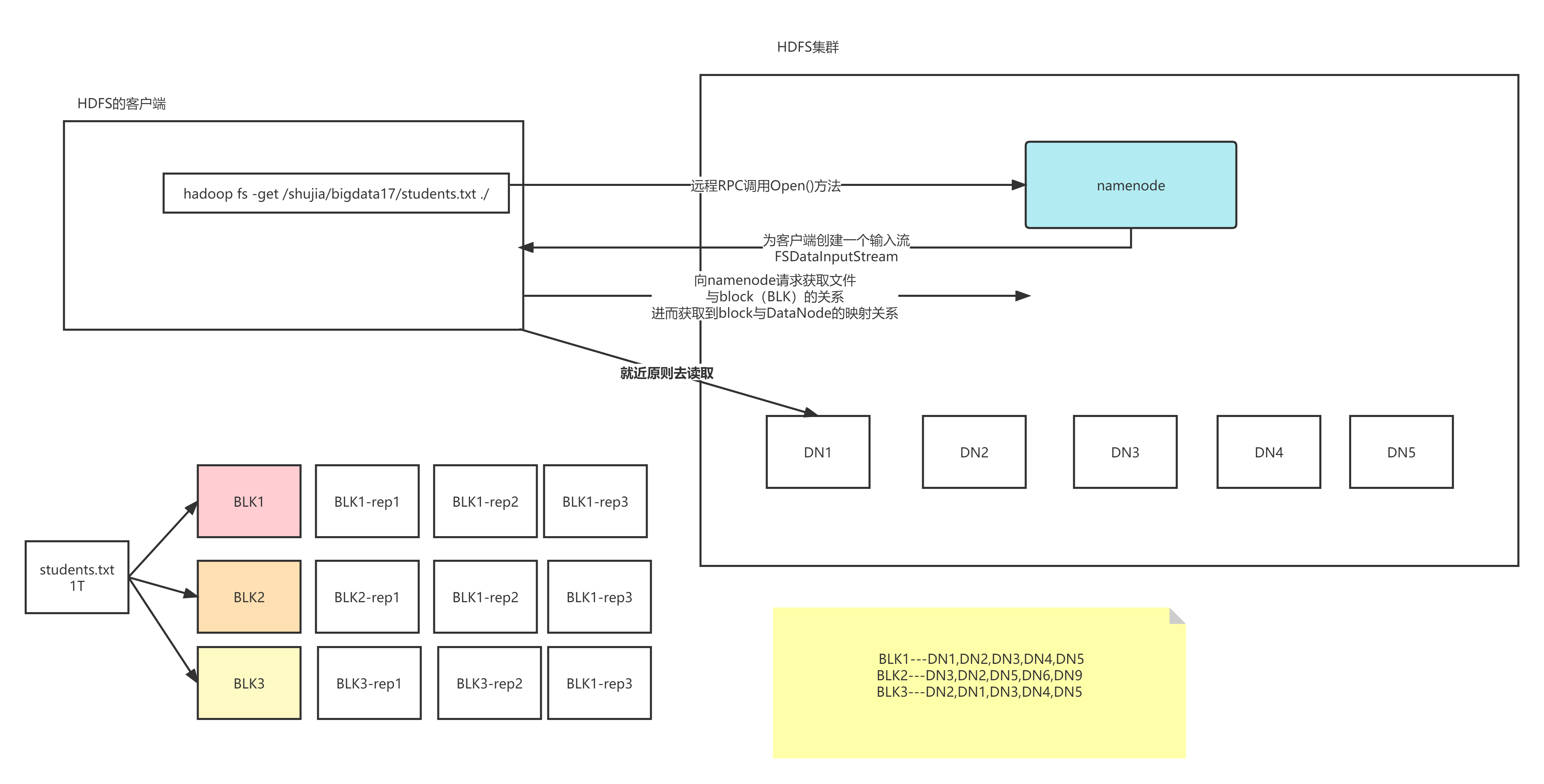 4.客户端要向nn询问第一个Block存放的位置