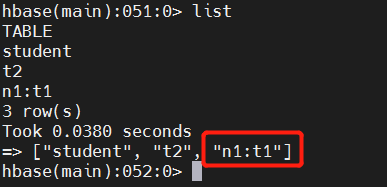 如果只想查看bigdata17这个命名空间中的表,如何实现呢? 可以使用命令list_namespace_tables