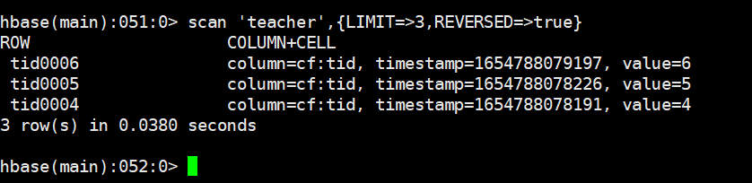 scan 'teacher',{LIMIT=>3,REVERSED=>true}