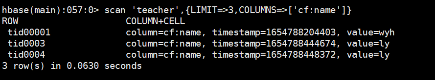 scan 'teacher',{LIMIT=>3,COLUMNS=>['cf:name']}