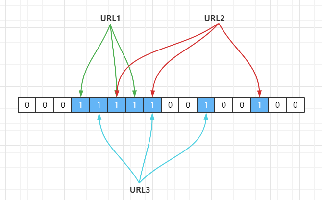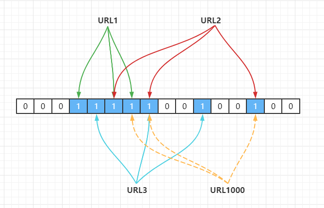 URL1是否在这个集合中,则通过Hash(urL1)计算出其下标,并得到其值若为 1 则说明存在。由于 Hash 存在哈希冲突,如上面