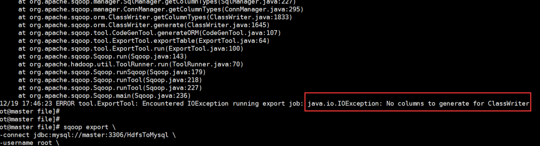 ERROR tool.ExportTool: Encountered IOException running export job: java.io.IOException: No columns to generate for ClassWriter