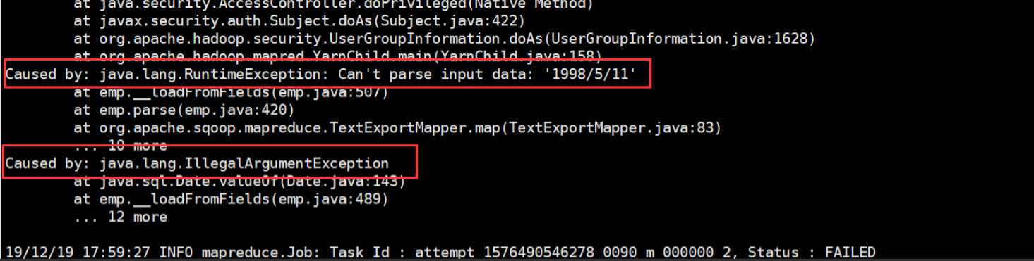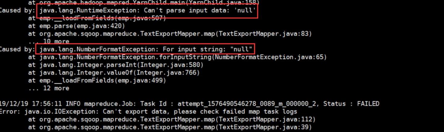 出现像这样的问题,大多是因为HDFS上的数据与关系型数据库创建表的字段类型不匹配导致的。仔细对比修改后,就不会有这个报错啦!!