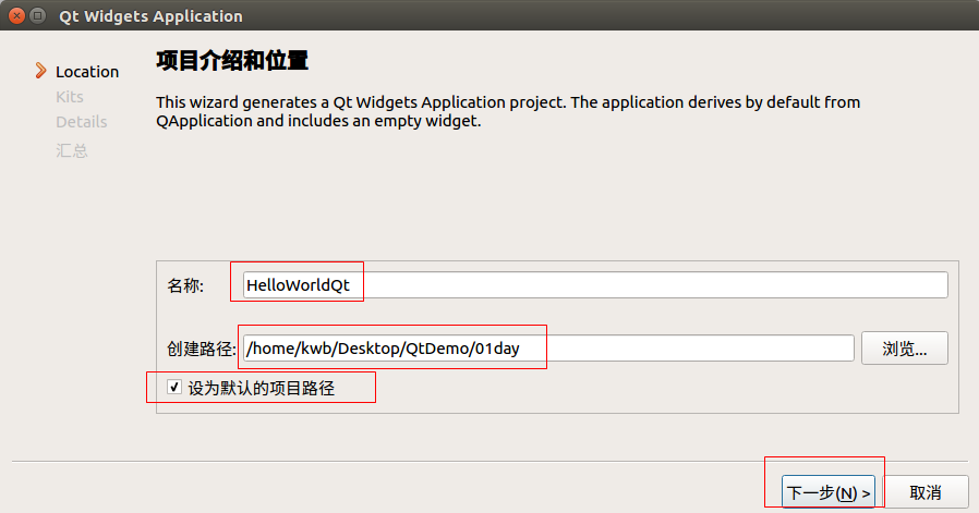 3、点击选择按钮之后会进入到项目介绍和位置界面,这里需要注意的是:名称和路径都不可以出现汉字,默认路径的选项可以根据自己的需要选择,然后点击一下步: