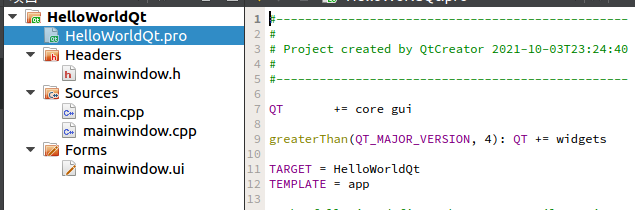 8、该项目里边有一个.pro文件,该文件是一个项目文件,一般情况我们是不需要进行任何的修改的,充其量我们会在开头添加一些Qt模块,后面需要的时候再介绍:
