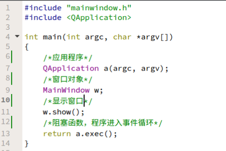 9、接下来是我们的的main.cpp文件的介绍,这个文件里只有一个main函数,也就是整个项目的入口函数,函数里边有一个QApplication类,这个类是Qt应用程序标准类,这个类在我们的Qt中是非常重要的,它负责Qt程序中整个事件的处理,程序运行起来是一个窗口,他会通过窗口触发一些事件,然后进入到相应的事件处理函数中执行相关的逻辑,如何进入呢?是通过return a.exec()进入的,他是一个阻塞函数,使得程序进入事件循环,让他不要结束,不要退成程序。