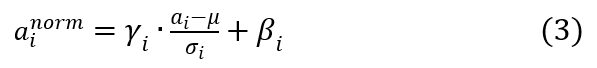 第二步参考公式(2),主要目标是让每个神经元在训练过程中学习到对应的两个调节因子,对规范到 0 均值,1 方差的值进行微调。因为经过第一步操作后,Normalization 有可能降低神经网络的非线性表达能力,所以会以此方式来补偿 Normalization 操作后神经网络的表达能力。
