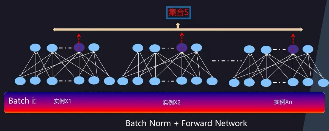 对于前向神经网络来说,BatchNorm 在计算隐层某个神经元 k 激活的规范值的时候,对应的神经元集合 S 范围是如何划定呢?图 6 给出了示意。因为对于 Mini-Batch 训练方法来说,根据 Loss 更新梯度使用 Batch 中所有实例来做,所以对于神经元 k 来说,假设某个 Batch 包含 n 个训练实例,那么每个训练实例在神经元 k 都会产生一个激活值,也就是说 Batch 中 n 个训练实例分别通过同一个神经元 k 的时候产生了 n 个激活值,BatchNorm 的集合 S 选择入围的神经元就是这 n 个同一个神经元被 Batch 不同训练实例激发的激活值。划定集合 S 的范围后,Normalization 的具体计算过程与前文所述计算过程一样,采用公式 3 即可完成规范化操作。