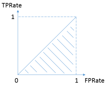 按照定义,AUC即ROC曲线下的面积,而ROC曲线的横轴是FPRate,纵轴是TPRate,当二者相等时,即y=x,如下图:
