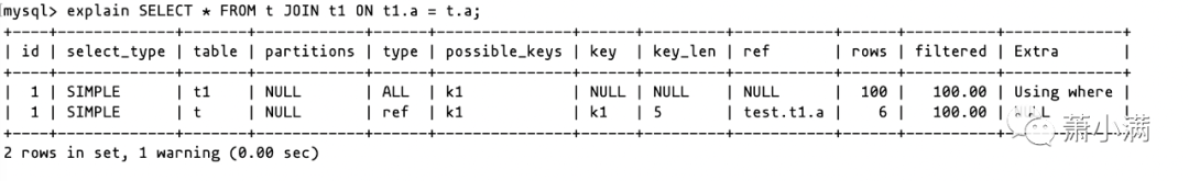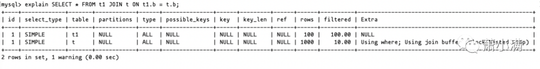 在没有索引的b列上进行连接,查看执行计划,可以看到采用的是BNL,这种连接的效率较低,应当尽量在需要连接的被驱动表列上建立索引。