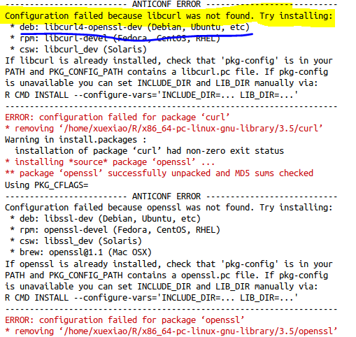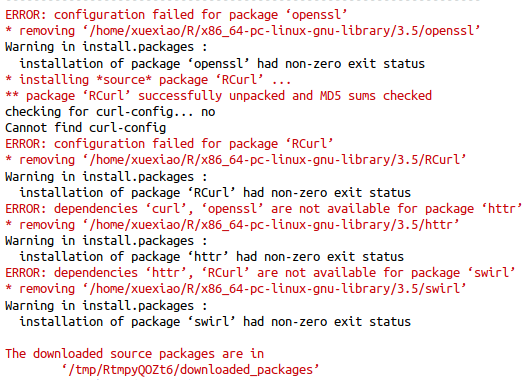 其实error:configuration failed for package "openssl" 以及checking for curl-config把为何无法安装说的很清楚,只需手动安装curl-config即可,可心大的博主并没有在意QAQ,更重要的是博主仔细看了看,报错上方就是解决方案_(:3 」∠)_